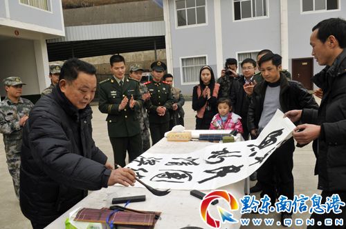 “有能肩國(guó)任,無(wú)欲鑄軍魂”、“軍民團(tuán)結(jié),魚水情深”、“社會(huì)主義好,人民軍隊(duì)親”……活動(dòng)現(xiàn)場(chǎng),貴州省書法協(xié)會(huì)理事、岑鞏縣委常委、縣委宣傳部長(zhǎng)陳永祥與幾位書法界的老師們現(xiàn)場(chǎng)為駐地官兵書寫激勵(lì)上進(jìn)的書法作品。