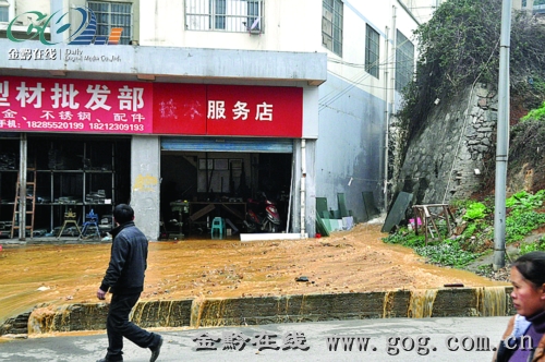 昨日下午4時10分許,凱棉路凱里武裝部旁側一圍墻垮塌,壓斷連接“兩河”安置小區的供水主管道,造成大量自來水沖向道路,凱棉路上至少兩家門面被水淹。