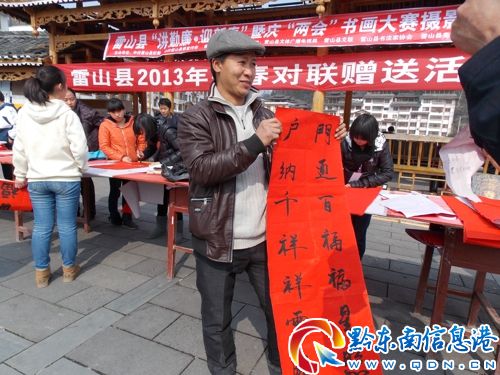 春節(jié)即將來(lái)臨,1月26日,雷山縣利用縣城趕場(chǎng)天,由中共雷山縣委宣傳部組織縣書(shū)法協(xié)會(huì)12名書(shū)法老師(其中,年齡最小的18歲,最高的60歲),在縣城木鼓廣場(chǎng)開(kāi)展“雷山縣2013年新春對(duì)聯(lián)贈(zèng)送活動(dòng)”,深受群眾歡迎。