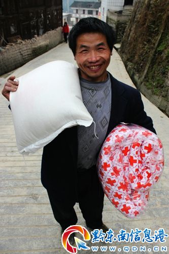 據悉,春節來臨之際,該縣發放城鄉低金、救災物資、貧困戶慰問款共6540萬元,發放救濟糧279萬公斤,讓特困城鄉黨員和貧困戶享受到黨和政府的溫暖。圖為西江鎮白碧貧困村民領到慰問品樂呵呵。(潘國雄 攝)