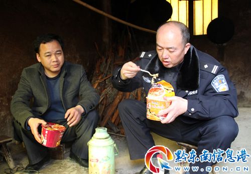 當走訪到戴光文家庭時,已經是中午12:30分,饑腸轆轆的大隊民警和田副書記婉言拒絕了群眾和村支書、村主任盛情的款待邀請,在回程途中向群眾討要了一壺開水泡了方便面就吃了起來。大隊副大隊長楊中海連吃兩“桶”方便面,直呼:舒服!(龍冠宇 何坪嶸)