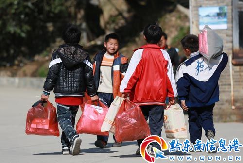 據了解,由中央電視臺、貴州團省委發起的“美麗貴州·萬件冬衣暖童心”關愛留守兒童活動自2012年12月中旬正式啟動后,得到了社會各界的積極響應。中宣部副部長、國家廣電總局局長蔡赴朝等幾人捐資10萬元為丹寨縣500名留守孩子送去冬衣、冬褲、保暖鞋等“愛心禮包”。(黃曉海 攝影報道)
