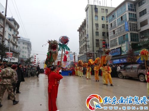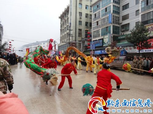 2013年2月14日下午,黎平縣城大街上禮花綻放,鞭炮齊鳴。人們以玩龍、解放軍吹號(hào)、扭秧歌、飾《西游記》中的唐僧師徒四人取經(jīng)等古代和現(xiàn)代民族文化藝術(shù)相結(jié)合的表演方式喜迎新春,深受群眾的喜愛(ài)和好評(píng)。