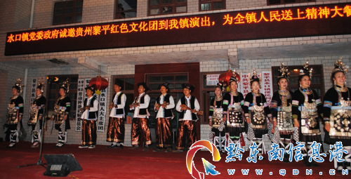春節(jié)前后,黎平紅色文化團(tuán)開(kāi)展送戲下鄉(xiāng)活動(dòng)。一個(gè)個(gè)精彩的紅色文化和民族文化節(jié)目獲得了在場(chǎng)觀眾的陣陣掌聲。圖為黎平紅色文化團(tuán)在水口鎮(zhèn)演出現(xiàn)場(chǎng)。(周志光 攝)