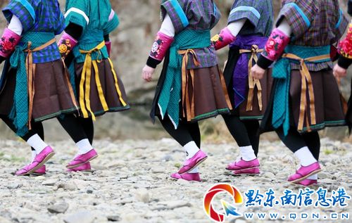 2月16日是貴州省丹寨縣南皋鄉償卡村一年一度的新春望會節,苗族村民們穿上傳統的盛裝及繡花鞋,踏著春天的氣息,伴隨著銅鼓樂聲翩翩起舞,各式的繡花鞋成了節日上的一道風景。圖為貴州省丹寨縣南皋鄉償卡村,苗族村民在跳銅鼓舞。(黃曉海)