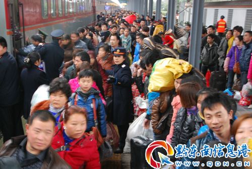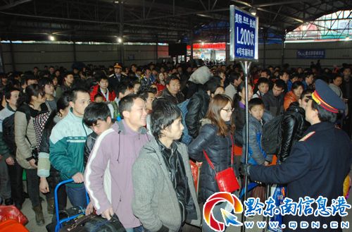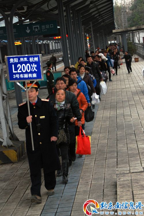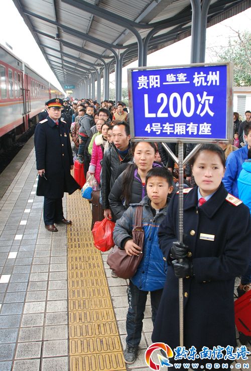 2月20日,成都鐵路局凱里火車站工作人員在有序組織引導旅客進站上車。