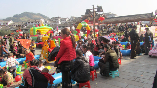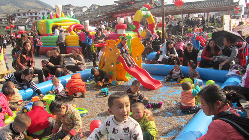 正月初六——元宵節,雷山舉辦猜燈謎活動、斗牛斗狗斗豬比賽、民間龍燈盛會、蘆笙舞、苗族情歌飛歌對唱等民俗活動。深受廣大群眾喜愛,群眾參與性高,吸引許多外來游客,帶動等其他產業發展,兒童娛樂場成了熱門,吸引上1000名孩子光顧。(圖為:雷山縣木鼓廣場兒童娛樂場熱鬧場景)