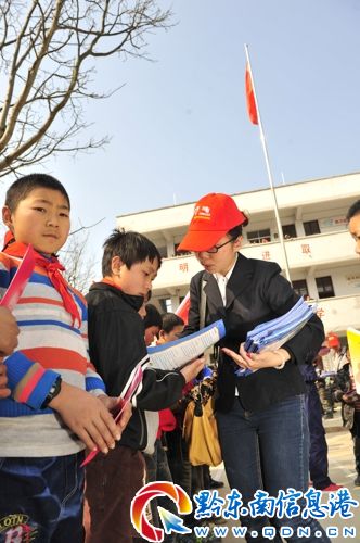 志愿者走進(jìn)雷山公統(tǒng)希望小學(xué),一場“愛心圓夢真情助學(xué)”活動(dòng)拉開了志愿者活動(dòng)的序幕,志愿者們?yōu)?2名學(xué)習(xí)優(yōu)異的貧困學(xué)生捐助了書包、書本等學(xué)習(xí)用品,青年志愿者們與貧困學(xué)生結(jié)成一對一的幫扶,點(diǎn)燃貧困學(xué)生對美好未來的希望。