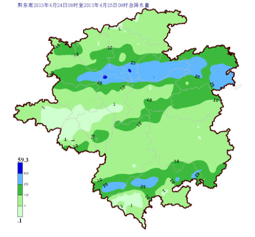 據監測, 24日8時至25日8時臺江南哨村59mm、鎮遠金堡51mm兩站暴雨,另有40站大雨,大雨主要集中在黃平、臺江、鎮遠、三穗、天柱、榕江、從江、黎平等8縣,其余小到中雨(具體降雨量見附圖)。