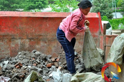 這幾位“等工師傅”攬到的活是搬運建筑垃圾,他們先將垃圾裝進袋子,然后挑到卡車上。每袋垃圾大約100斤重,挑運過程中,要經過幾道較狹窄的樓梯,不僅不暢通,還有安全隱患,所以,每次從樓梯經過,“等工師傅”們都得小心翼翼。干了一個多小時,大家感覺累了,便停下來休息,一位“等工師傅”兜里有瓜子,她大方掏出來,讓大伙分享。