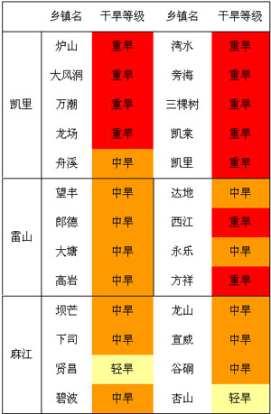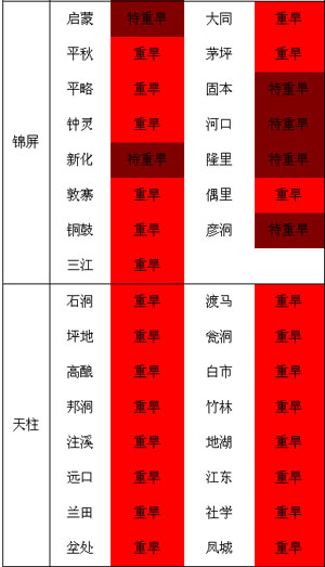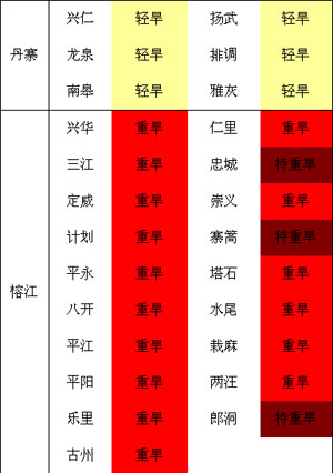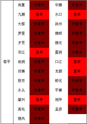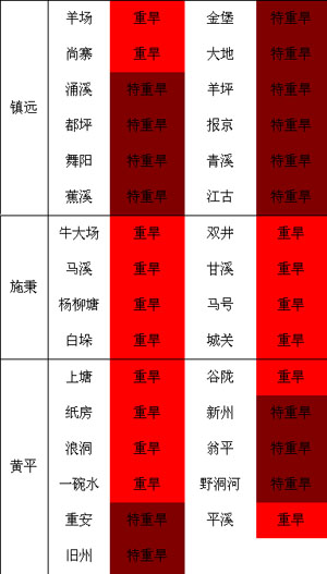 截止8月5日氣象干旱監(jiān)測(cè),我州岑鞏、鎮(zhèn)遠(yuǎn)、黃平、三穗、劍河、黎平6縣為特重級(jí)氣象干旱;凱里、施秉、天柱、錦屏、臺(tái)江、榕江、從江7縣為重級(jí)氣象干旱;其余地區(qū)為中到輕級(jí)氣象干旱。