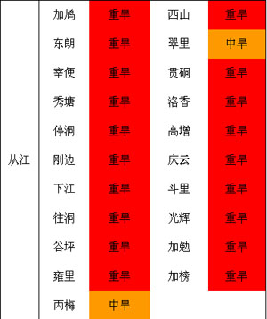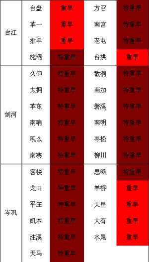 我州旱情維持。其中71個(gè)鄉(xiāng)鎮(zhèn)特重級(jí)氣象干旱,占全州鄉(xiāng)鎮(zhèn)35.7%;重級(jí)氣象干旱為104個(gè)鄉(xiāng)鎮(zhèn),占鄉(xiāng)鎮(zhèn)52.3%。旱情分布如下圖表所示: