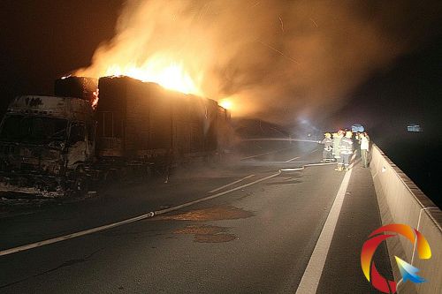 8月28日凌晨1時許,一輛裝載木材的掛車行至廈蓉高速1215KM處時突然燃燒起來,熊熊的火焰映紅了半邊天……事發(fā)后,榕江消防與高速交警聯(lián)手救援,終將火魔降服。