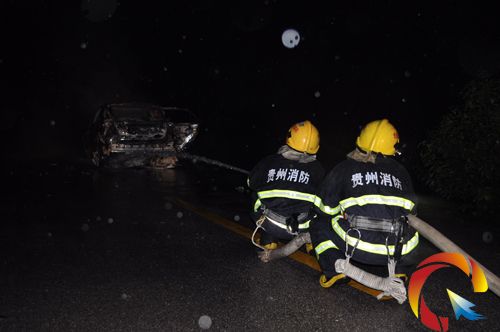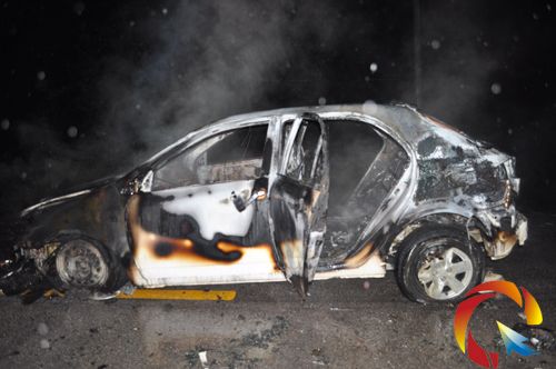 23時13分,消防官兵趕到現場后,發現現場1輛小轎車正在燃燒,火勢正處于猛烈階段,車內無人員被困。根據現場情況,指揮員迅速下達戰斗命令,第一小組做好現場警戒,防止二次事故發生;第二小組出一支水槍對車體進行掃射,對火勢進行撲救。經過消防官兵近20分鐘的努力,車上火勢已成功被撲滅。隨后,消防官兵又仔細對車輛進行了檢查,并用水槍將車身內外進行射水降溫,確保轎車已無復燃的可能后,將現場移交給交警部門和車主,撤離了事故現場。