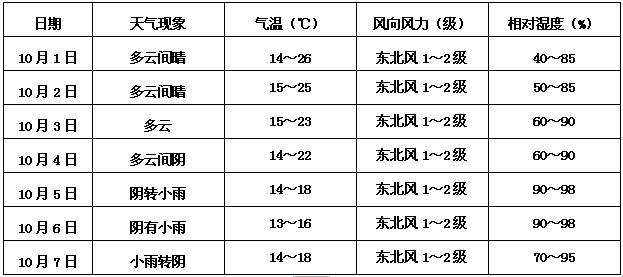 9月30日~10月2日:全州多云間晴,大部地區最低氣溫12~16℃,最高氣溫26~29℃;