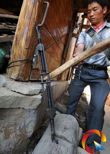 這里面所用的工具是大家都基本熟知的千斤頂、鋼絲繩、滾筒、抓釘等,只有一種叫“絲鼎”的工具少見又最重要。吳如幫坦言,雖然技術含量不高,也不需要繪圖紙,全憑自己的豐富經驗來完成,但很多人都想拜他為師,他不愿。“我只想把它傳給我兒子,希望他以后與我一樣能找碗飯吃”。