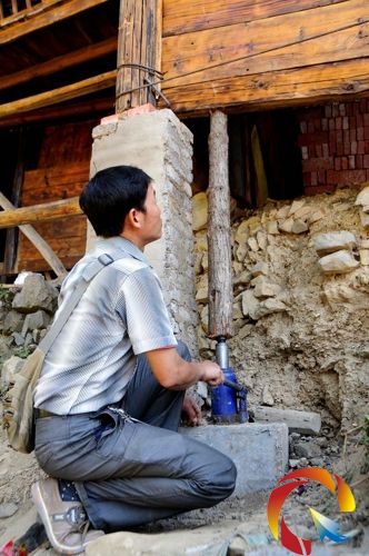 “這幾天我在幫一戶村民家的老屋進行較正與抬升。”吳如幫帶著記者走近村民王明生家,指著這棟基本已完工的兩層老木房對記者說。戶主王明生稱,他家這木房已有50多年的歷史了,由于父輩們建房時只是簡單地在木柱下用幾塊大石頭來支撐和承重,基腳不穩固,加上地質的原因,天長日久整棟重達30多噸重的木房便向一側傾斜,如今傾斜很歷害。于是,王明生請來了吳如幫,在吳一個人的鼓搗下,才3天功夫,房子扶正了,木房下陷處又抬高了一米多。“現在這棟木房只等用磚塊和混凝土將底層砌成磚墻便永遠牢固了。”王明生說。