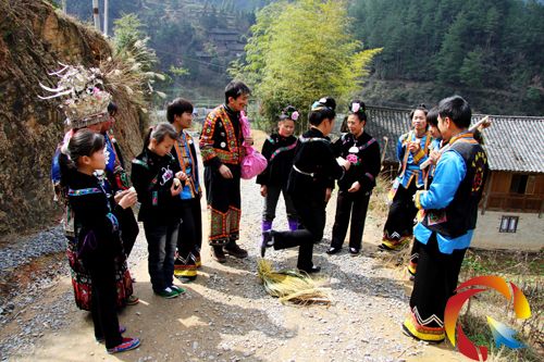 到新娘家,首先放萬響鞭炮,接后每人要完成三道攔門6牛角酒的考驗。倒下者則取消本次婚事。