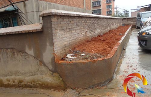 小區圍墻和地上殘留的黃泥土