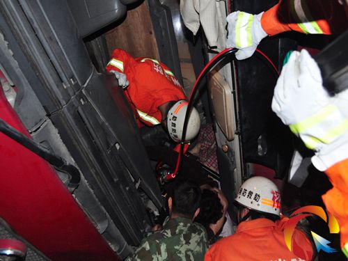 于是指揮員命令,戰(zhàn)斗小組利用液壓剪切鉗和液壓頂桿擴(kuò)充救援空間,讓救援官兵有操作空間。首先利用液壓剪切鉗剪斷駕駛室操作臺,然后利用液壓頂桿頂住座椅和操作臺,使被困人員有活動空間,隨后指揮員發(fā)現(xiàn)被困人員可以從現(xiàn)有空間中救援出來,于是命令戰(zhàn)斗員扶住被困人員的大臂一點一點的挪出事故車輛,至此,成功將被困人員救出。