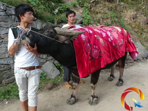 上寨村原本是養育有斗牛的,但前不久,它在征戰中敗北。后村民們合議之后,便將它賣掉了。為了在地方上“不丟臉”,上寨村民最近又集資買了一頭斗牛,這才引來了友鄰村寨前來道賀。(楊仁彬 楊成利 攝影報道)