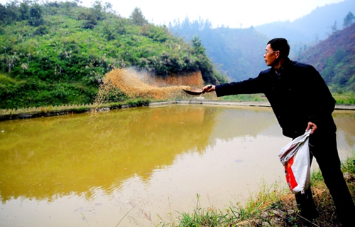榕江吳國澤正在撒料喂魚。(李長華 攝)
