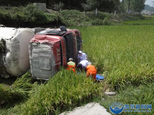 13時(shí)23分到達(dá)現(xiàn)場后,通過詢問現(xiàn)場群眾得知:一輛運(yùn)水泥的槽車由于路基塌陷導(dǎo)致車輛側(cè)翻到路邊的稻田里,駕駛員被困于車內(nèi)。先到達(dá)事故現(xiàn)場的醫(yī)護(hù)人員已對(duì)車內(nèi)的受傷駕駛員進(jìn)行了簡單治療,即將準(zhǔn)備將傷員抬上擔(dān)架。了解情況后,三名戰(zhàn)士立即跑到車頭,將受傷駕駛員抬上醫(yī)用擔(dān)架,并隨醫(yī)護(hù)人員一同將傷者抬上救護(hù)車,把傷員轉(zhuǎn)交給醫(yī)護(hù)人員后,官兵們收拾器材撤離現(xiàn)場。