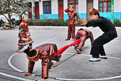 三穗縣桐林小學(xué)為了激發(fā)學(xué)生的興趣,自今年9月新學(xué)期開學(xué)以來,該校將諸多侗族文化元素引進(jìn)校園,增設(shè)侗語課教學(xué)、開設(shè)侗族山歌舞蹈特長班,把鞭笞陀螺、踢毽子,高腳馬、押加、射箭、滾鐵環(huán)等民族體育項(xiàng)目列為體育課的主要內(nèi)容,既豐富了學(xué)生的校園文化生活,又傳承了侗族文化。