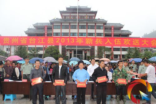 9月5日上午,在臺江縣送兵大會上,縣四大班子主要領導和人武部部長、政委為入伍大學生家長現場發放了獎勵金每人2000元。縣委戚詠梅書記和成兵縣長在講話中向廣大入伍新兵及家屬承諾:縣委、縣政府一定認真落實擁軍優屬相關政策,照顧好新兵家屬,希望同志們到部隊后安心服役,為家鄉父老鄉親增光添彩!(周興江 鐘榮祥)