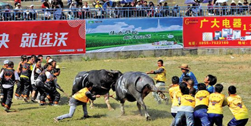 一項(xiàng)融合斗牛舞、月牙鏜、牛王爭霸為一體的新興文化產(chǎn)業(yè)正在天柱加快形成。上圖為牛王爭霸賽精彩場面。(楊俊)