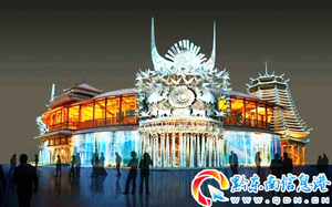 站在假山前的舞臺上回望,貴州館主體建筑呈現(xiàn)在了記者眼前,它是拱圓形的風雨長廊,長廊的兩邊分別是苗寨的吊腳樓和侗鄉(xiāng)鼓樓。貴州館的標志性飾物是懸掛館外的精美銀飾,總計是兩大塊。據(jù)了解,很多到西出口民族文化園的游客,就是通過這些銀飾認出貴州館的。