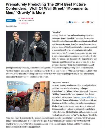 近日,被稱為“奧斯卡前哨”的著名電影媒體“IndieWIRE”公布了2014年奧斯卡最佳影片的預測名單。名單中包括《了不起的蓋茨比》、《重力》、《華爾街之狼》等在內的多部優秀影片。其中,由資深投資人、媒體人吳征先生擔任執行制片人的兩部影片《摩納哥的格蕾絲》(Grace Of Monaco)、《卑賤人生》(Low Life)也在榜單之中,成為角逐2014年奧斯卡最佳影片獎項的有力競爭者。