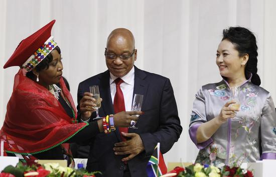當地時間3月26日,比勒陀利亞,南非總統祖馬夫婦為到訪的習近平舉行歡迎午宴。圖為祖馬夫人向習近平夫人彭麗媛敬酒。