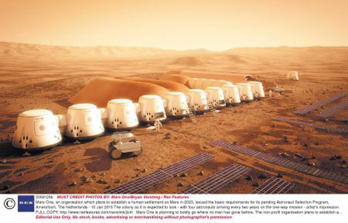 據介紹,“火星一號”計劃的專家將確定前三輪的通過名單,選出24—40名候選者。最后一輪的選拔過程則將通過電視直播,由世界各地的觀眾投票決定第一批火星定居者的最終人選。