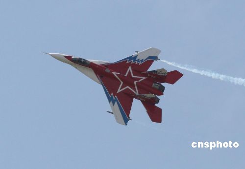 資料圖:圖為俄制米格29戰(zhàn)機在航展上進行飛行表演。
