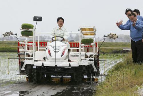 5月12日下午,日本首相安倍晉三在仙臺市若林區駕駛插秧機,因軌跡偏右而被提醒需向左調整。