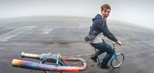 6月18日 據外媒報道,英國一名32歲的水管工弗茲(Colin Furze)向來喜歡挑戰極速,他把自制噴氣式發動機安裝到自行車上,使該自行車時速高達80公里,這或許是世界上“最危險”的自行車了。