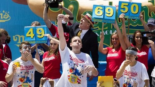 “大白鯊”徹斯納特(Joey Chestnut)吃下69個(gè)熱狗,蟬聯(lián)男子組冠軍。