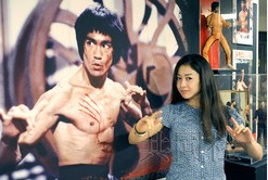 奇演員李小龍在逝世40周年之際,相關傳記電影在日本陸續上映,周邊產品的人氣也重新燃起。圖為粉絲在位于東京新宿的新宿武藏野館中真人大小的李小龍海報前擺出武打造型。(圖片來自共同網)