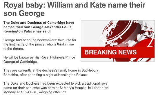 據英國媒體報道,威廉王子和凱特王妃為英國王室寶寶起名為喬治·亞歷山大·路易斯(George Alexander Louis)。并會成為“劍橋喬治王子(His Royal Highness Prince George of Cambridge)”肯辛頓宮已經確認了這一消息。如果小喬治將來成為國王,將會成為英國的喬治七世。目前小喬治正和父母在凱特王妃父母位于伯克郡的家中。