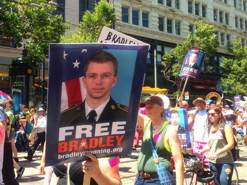 2013年6月,參加舊金山同性戀大游行的民眾舉著“釋放布拉德利·曼寧”的牌子,對其泄密行為表示支持。