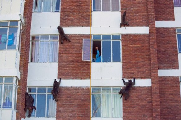 據(jù)英國(guó)《每日郵報(bào)》8月2日?qǐng)?bào)道,近日,南非開普敦的大街上上演了一場(chǎng)人類與狒狒之間的游擊戰(zhàn),成群的狒狒爬上公寓兩側(cè),撬開窗戶,入室搶劫。而居民只能用彩彈槍和胡椒噴霧器驅(qū)逐它們。居民的忍讓使得狒狒們有恃無恐,很多居民的財(cái)產(chǎn)都受到嚴(yán)重的損失。
