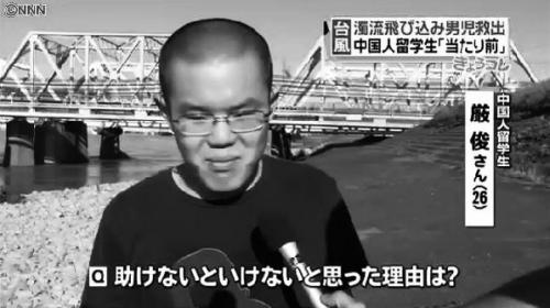 據日本時事通訊社等多家媒體16日報道,當天下午5時左右,在大阪市北區豐崎的日本鐵道東海道新干線高架橋附近,一名9歲的日本小學4年級男孩和2名中學生在淀川河邊拍攝因臺風“萬宜”而泛濫的河水風景時,由于相機SD卡不慎掉落河堤,小男孩俯身去撿,不幸腳下一滑掉入河中。湍急的河水將這名男孩沖走350米至淀川下流。就在這危急時刻,剛好從附近經過的中國留學生嚴俊看到后立即跳入水中,游了15米終于將男孩抱上岸。