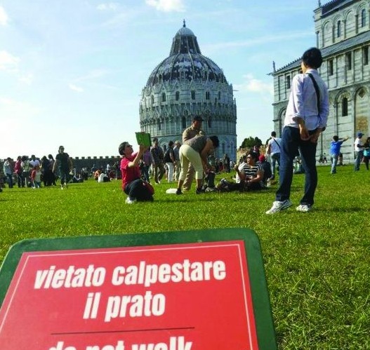在比薩斜塔前面有一大片草坪,10月2日下午,雖然有明確標識不能踐踏草坪,但不少來自各國的游客進入草坪以取得更好的拍照角度,其中以黃皮膚、說漢語的中國人為多。他們在草坪上或躺、或坐、或踢腿,擺出各種姿勢拍照,更有人在草坪中間席地開餐,取出水果面包等大吃。