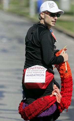 他用5小時(shí)48分27秒的成績(jī)跑完馬拉松,還織完一條圍巾。這條圍巾長(zhǎng)12.13英尺(約3.7米),打破英國(guó)女子蘇西(Susie Hewer)今年4月在倫敦刷新的吉尼斯世界紀(jì)錄。當(dāng)時(shí)蘇西一邊跑馬拉松一邊織圍巾,織了一條6.9英尺(約2.1米)長(zhǎng)圍巾。