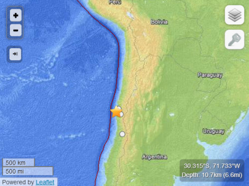 此次地震震中發(fā)生在距智利西南部城市科金博54公里處,震源深度為10.7公里。地震發(fā)生時(shí),首都圣地亞哥不少建筑物搖晃。