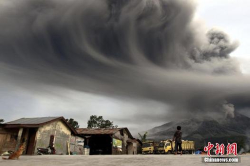 資料圖:11月18日,印度尼西亞卡羅(Karo)附近,一名村民望著錫納朋火山(Mount Sinabung)噴射出火山灰。