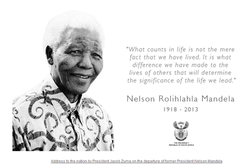 南非總統府官網刊登的是曼德拉的一句名言:“生命中最重要的東西不是僅僅活著,而是我們給別人的生命帶來了何種不同。這才是生活的意義。”