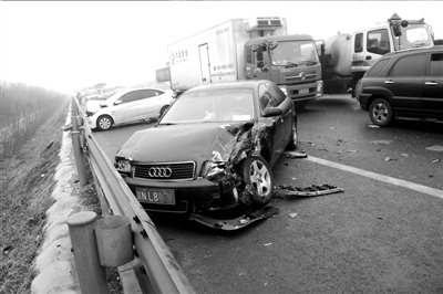 向南約200米處,又有5輛汽車連續追尾擠成一團,繼續向南50米處,一輛寶馬車與一輛大貨車發生事故。