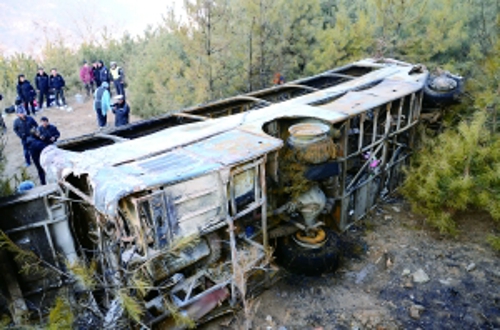 車輛落下山溝時,一些乘客被甩出車輛,他們受了傷但活了下來。救援人員隨后在燒焦的車輛殘骸(見圖)和樹林中找到了16名遇難者的遺體。事故還造成34人不同程度受傷,其中2人搶救無效死亡,目前還有32人在醫(yī)院治療。另外,車上還有4人因基本無事而自行回到了目的地。